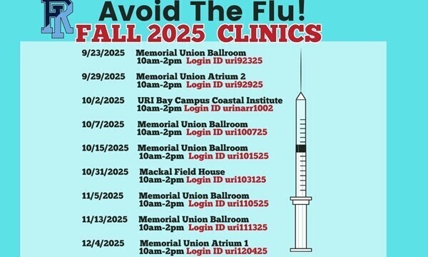 - Nov 5, 2025: Flu Clinics at Memorial Union BallroomRegister for the upcoming flu clinics. use provided Login ID for online registration or visit REGISTER HERE 9/23/2025 Memorial Union Ballroom 10am-2pm Login ID uri92325 9/29/2025 Memorial Union Atrium 2 10am-2pm Login ID uri92925 10/2/2025 URI Bay Campus Coastal Institute 10am-2pm Login ID urinarr1002 10/15/2025 Memorial Union Ballroom 10am-2pm Login ID uri101525 10/31/2025 Mackal Field House 10am-2pm Login ID uri103125 11/5/2025 Memorial Union Ballroom 10am-2pm Login ID uri110525 11/13/2025 Memorial Union Ballroom 10am-2pm Login ID uri111325 12/4/2025 Memorial Union Atrium 1 10am-2pm Login ID uri120425 Visit URInvolved for complete event details. View on site | Email this event