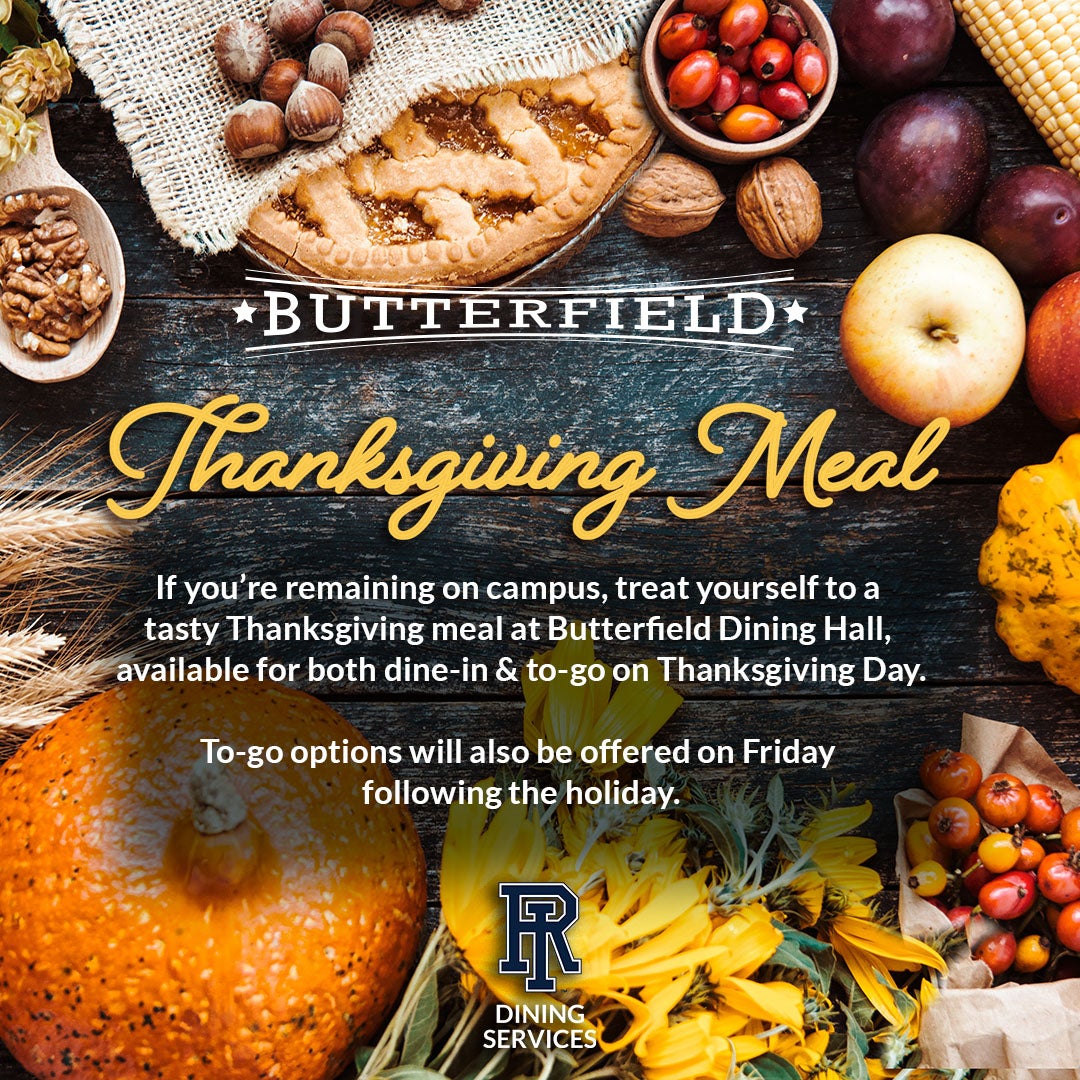 If you’re remaining on campus, treat yourself to a tasty Thanksgiving meal at Butterfield Dining Hall, available for both dine-in and to-go on Thanksgiving Day. To-go options will also be offered on Friday following the holiday. Wishing you all a relaxing, happy, and well-deserved break! 🦃🍂