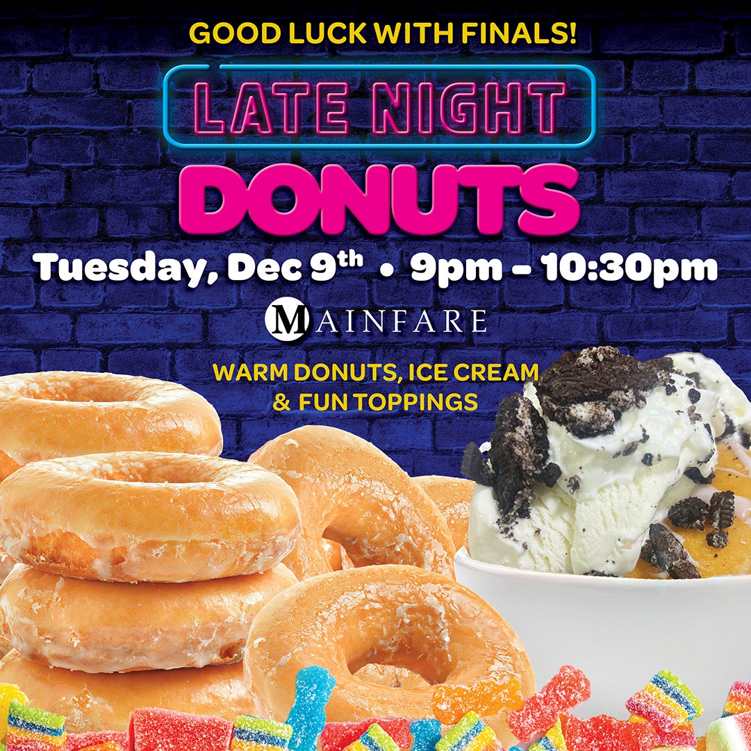 Get a pick-me-up before finals at Mainfare Dining Hall with a special treat of warm donuts, ice cream and fun toppings! Tuesday, December 9th 9pm – 10:30pm