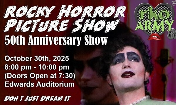 - Oct 30, 2025: Rocky Horror Picture Show LIVE ft. RKO Army [50th Anniversary Show] at Edwards AuditoriumCelebrating 50 years of Rocky Horror Picture Show. Let’s do the time-warp again! It’s a late night double feature picture show! The RKO Army will join us to do a live-cast performance and showing of the Rocky Horror Picture Show. Don’t know what Rocky Horror is? It’s a campy comedy classic from 1975 – and RKO Army has been performing the Rocky Horror Picture Show ever since 1978! Every year this event continues to be a blast-- come find out what keeps this double feature alive for fifty years! This event is explicitly for community members who are 18+. Visit URInvolved for complete event details. View on site | Email this event